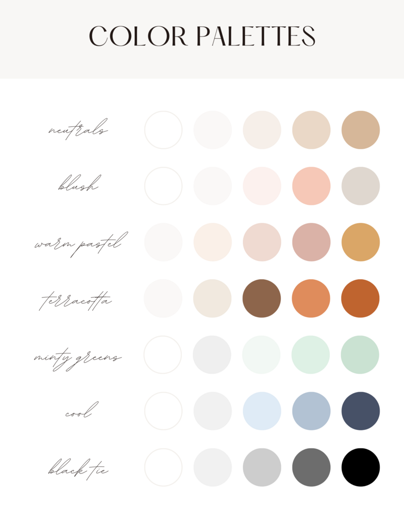 Neutrals (white, beige, black, cream), muted tones (sage, blush, slate), or warm earth tones (terracotta, olive) keep the look classic. Avoid neons, busy logos, or clashing prints.